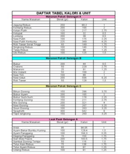 Daftar tabel kalori & unit.